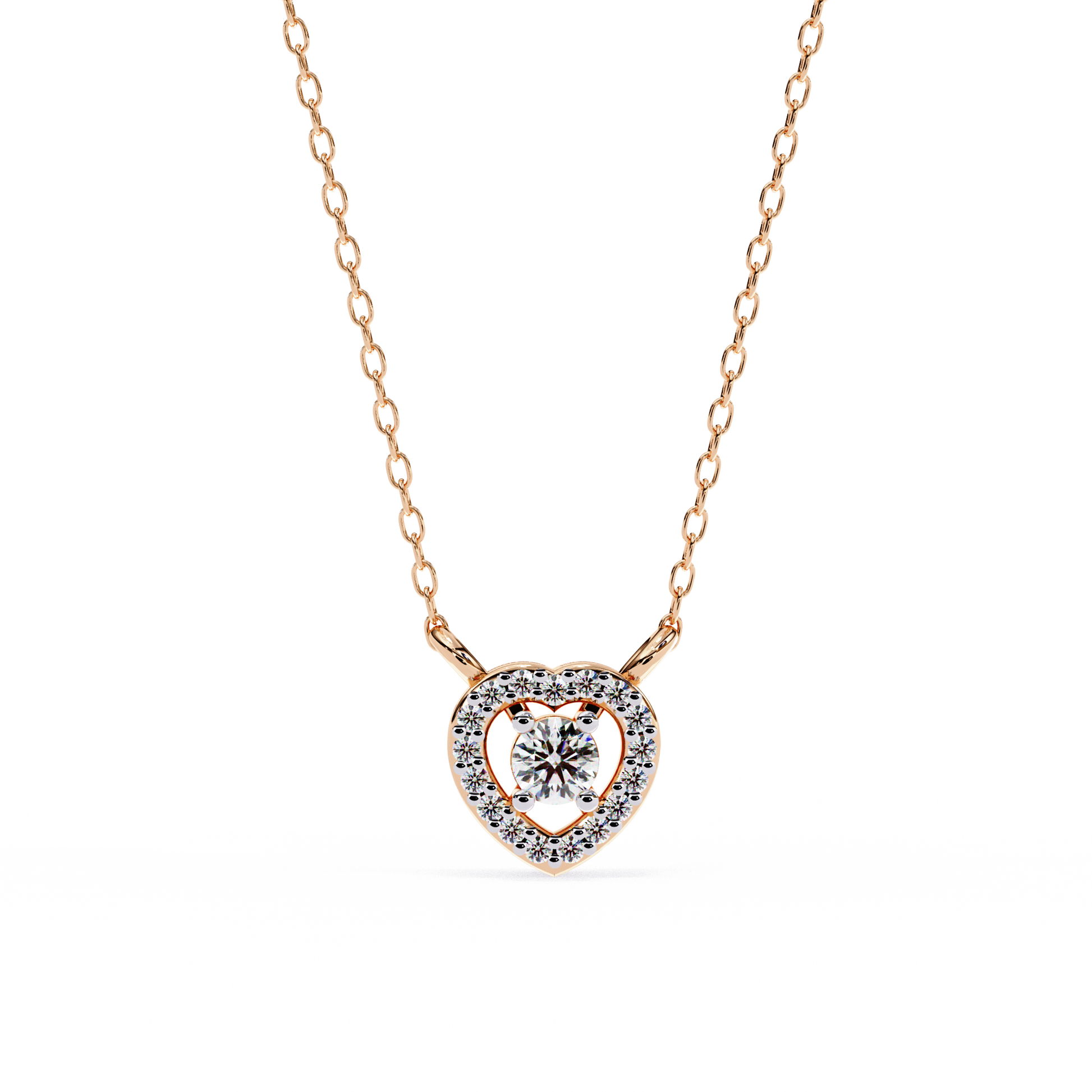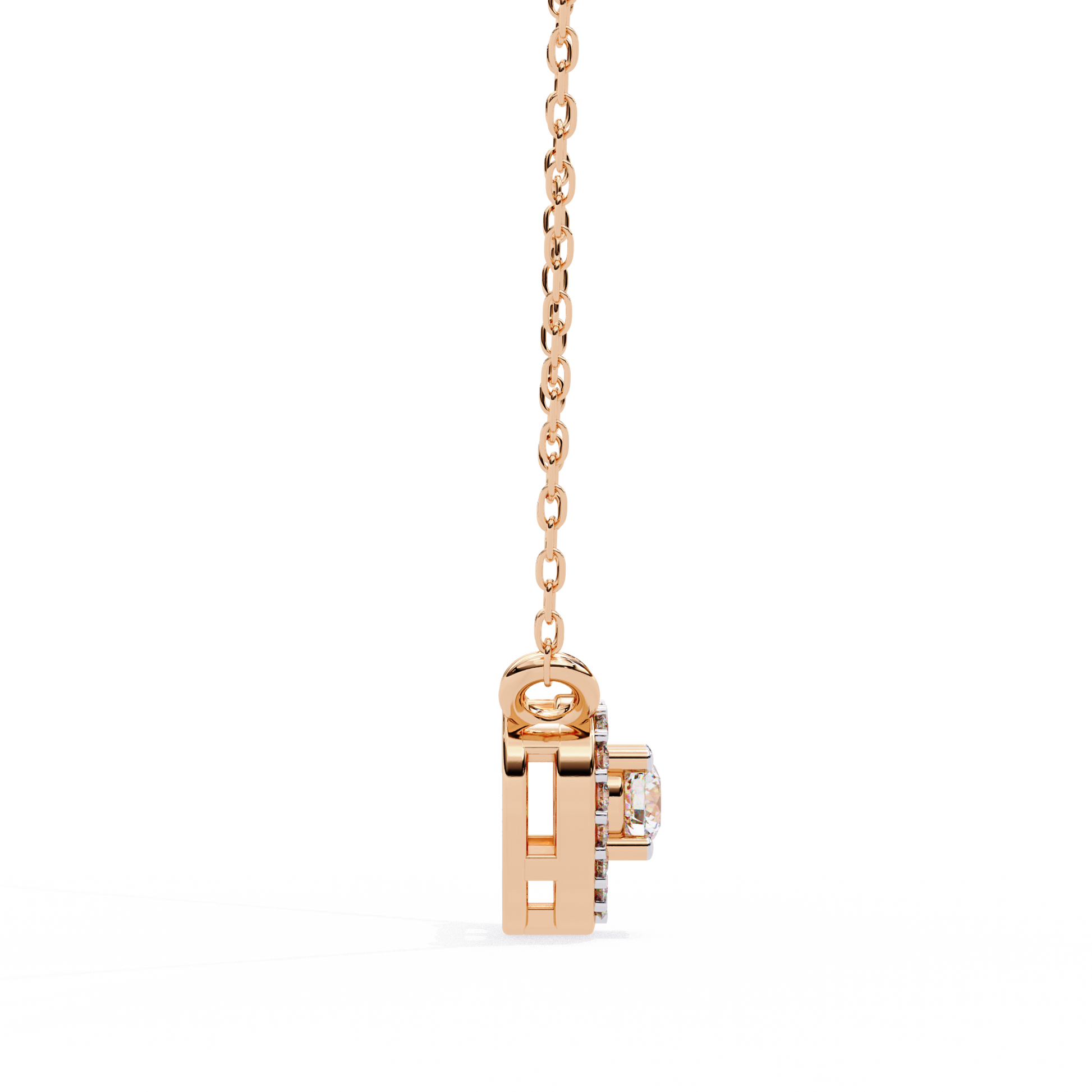 Experience the luxury of a high-quality round designer halo pendant in rose gold, set with a beautiful round-cut diamond surrounded by a halo of diamonds.