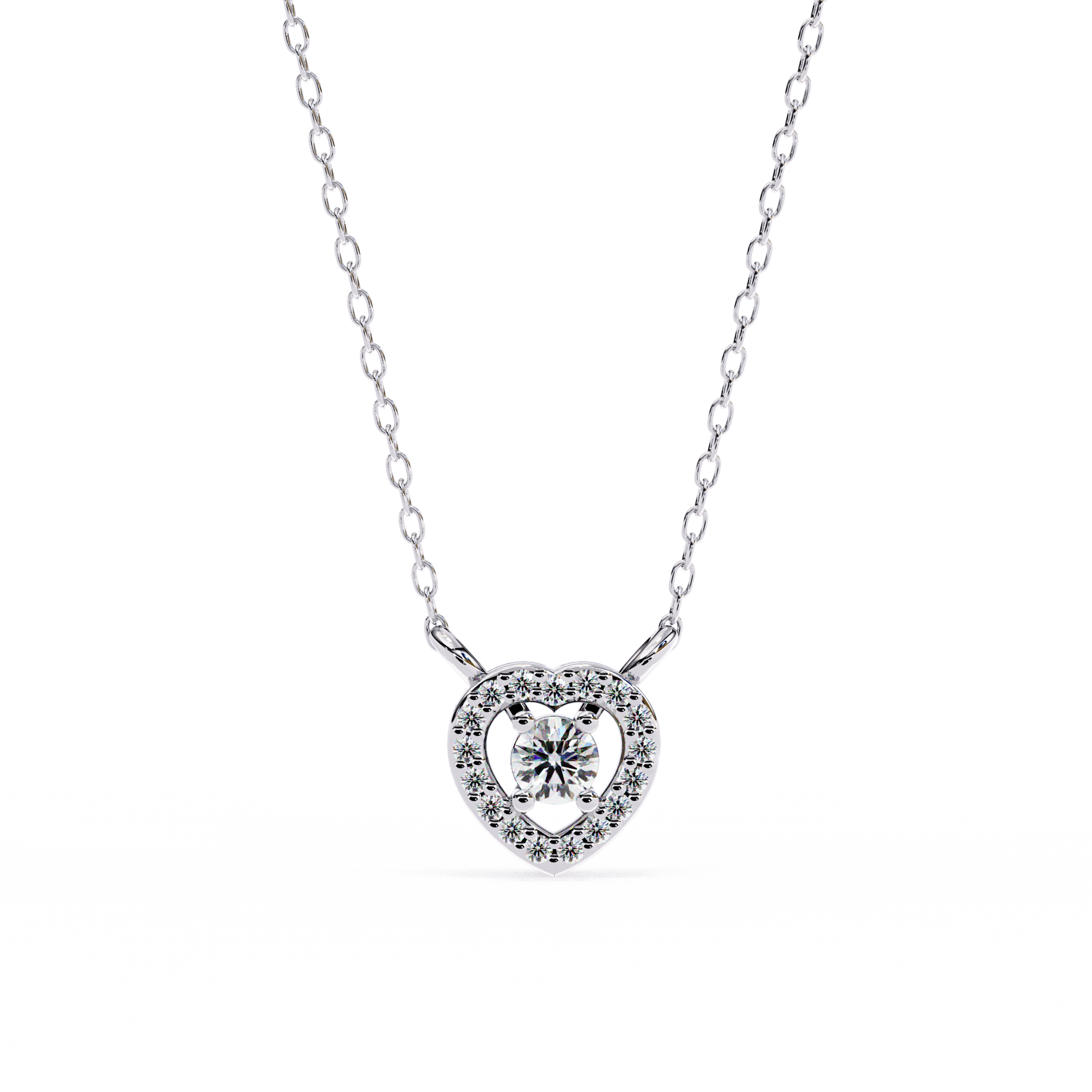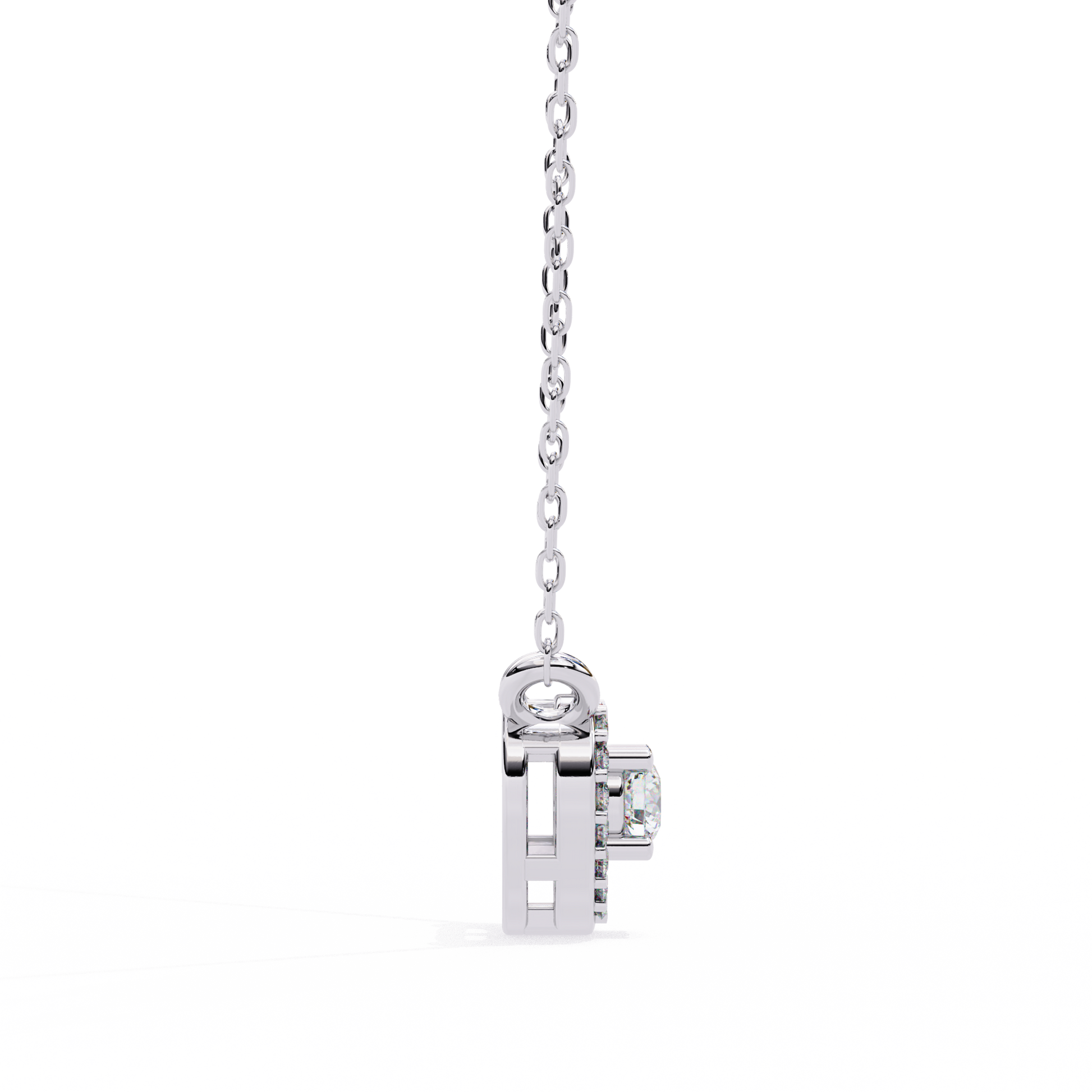 Experience the luxury of a high-quality round designer halo pendant in white gold, set with a beautiful round-cut diamond surrounded by a halo of diamonds.